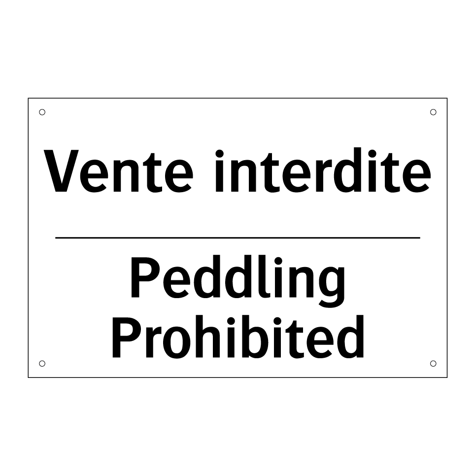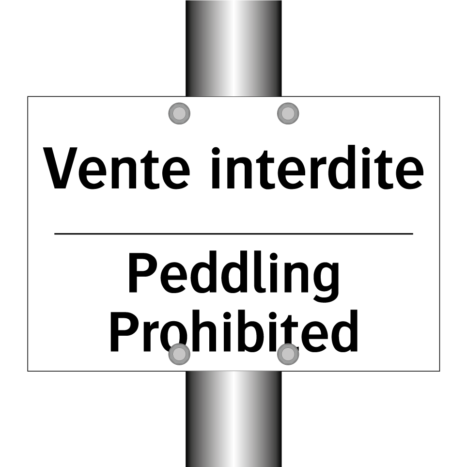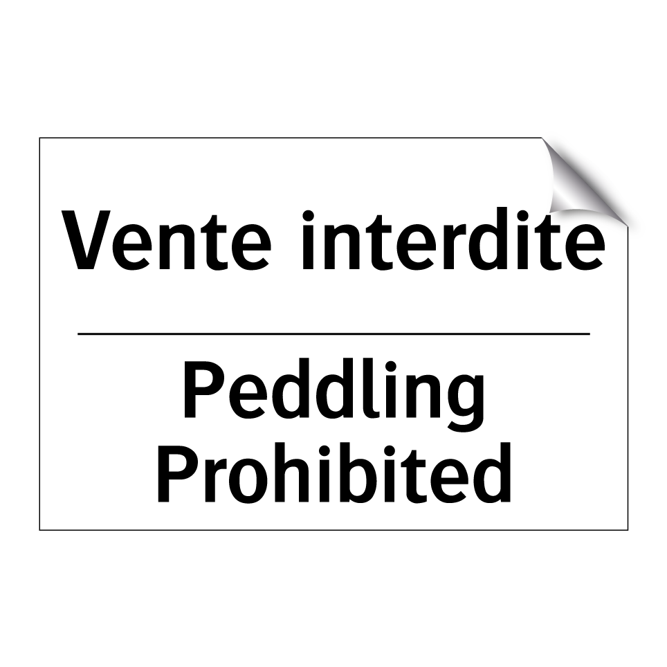 Panneau d'interdiction bilingue avec texte en français : "Vente interdite", et en anglais : "Peddling Prohibited"
