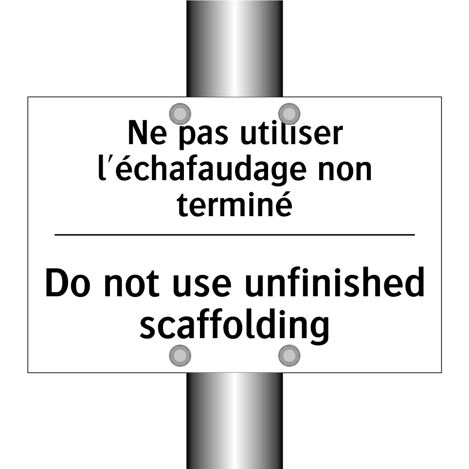 Panneau d'interdiction bilingue avec texte en français : "Ne pas utiliser l'échafaudage non terminé", et en anglais : "Do not use unfinished scaffolding"