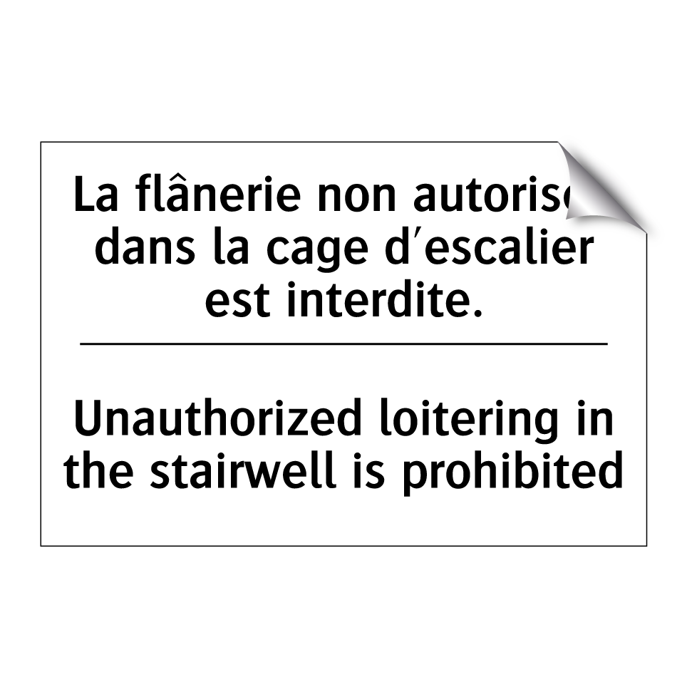 Panneau d'interdiction bilingue avec texte en français : "La flânerie non autorisée dans la cage d'escalier est interdite.", et en anglais : "Unauthorized loitering in the stairwell is prohibited"