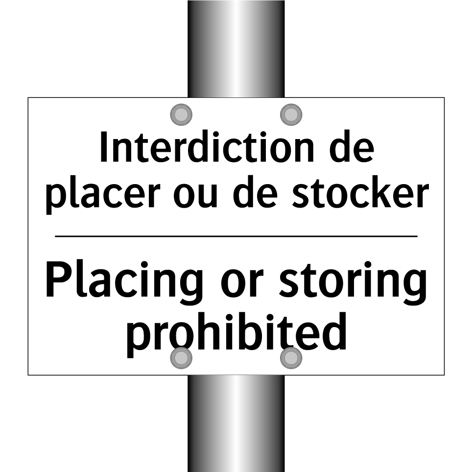 Panneau d'interdiction bilingue avec texte en français : "Interdiction de placer ou de stocker", et en anglais : "Placing or storing prohibited"