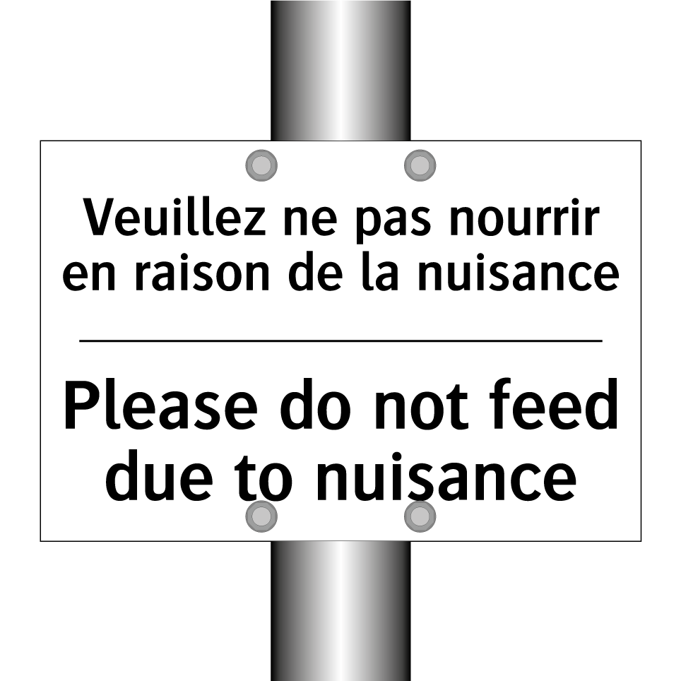 Panneau d'interdiction bilingue avec texte en français : "Veuillez ne pas nourrir en raison de la nuisance", et en anglais : "Please do not feed due to nuisance"