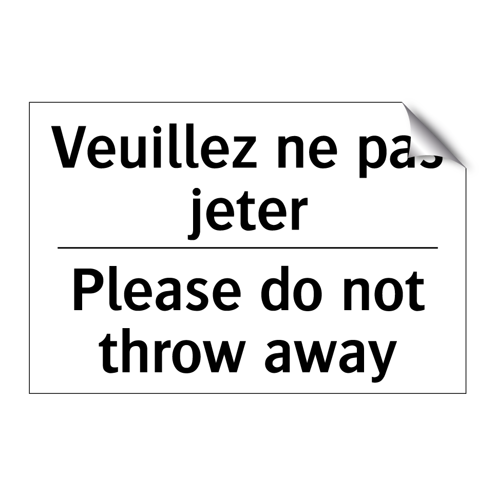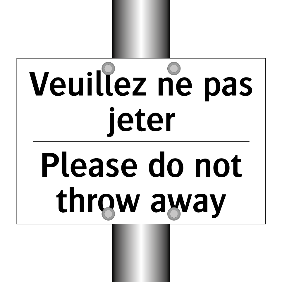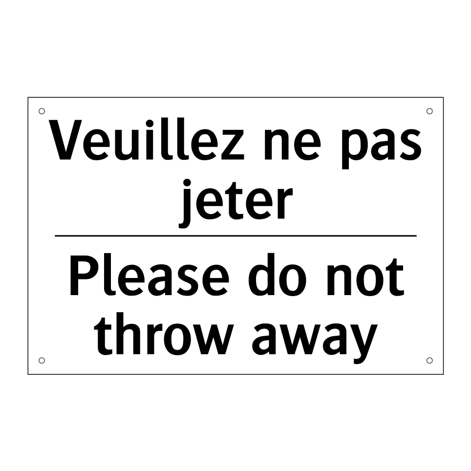 Panneau d'interdiction bilingue avec texte en français : "Veuillez ne pas jeter", et en anglais : "Please do not throw away"