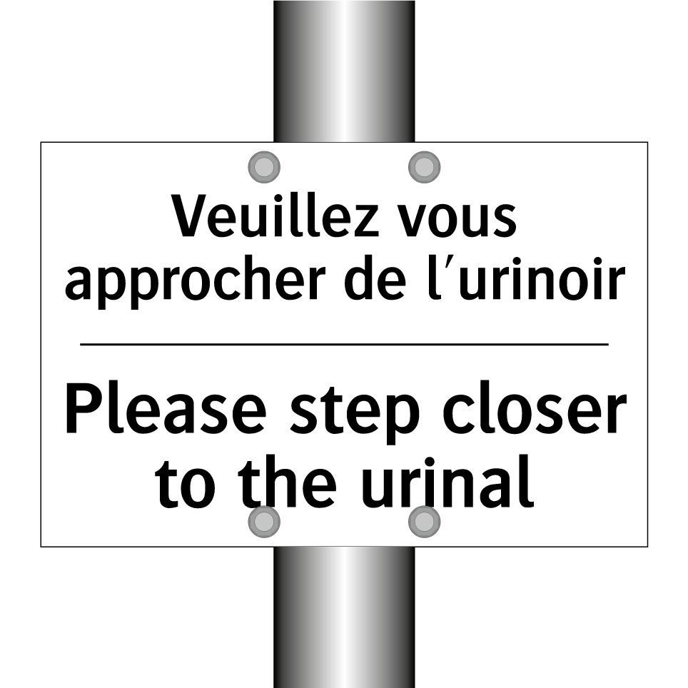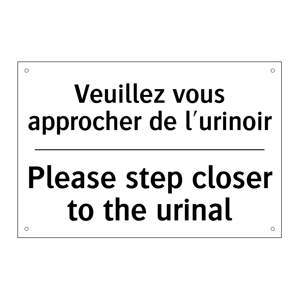 Panneau d'interdiction bilingue avec texte en français : "Veuillez vous approcher de l'urinoir", et en anglais : "Please step closer to the urinal"