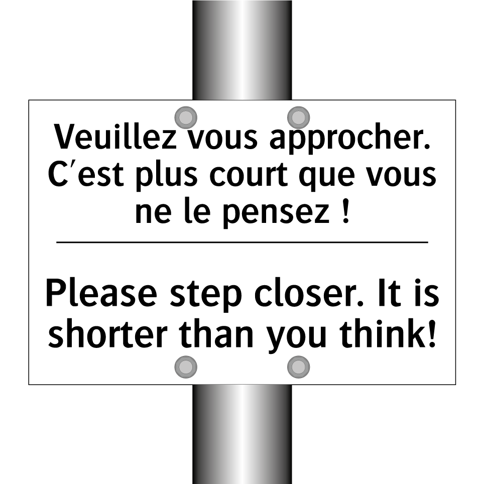 Panneau d'interdiction bilingue avec texte en français : "Veuillez vous approcher. C'est plus court que vous ne le pensez !", et en anglais : "Please step closer. It is shorter than you think!"