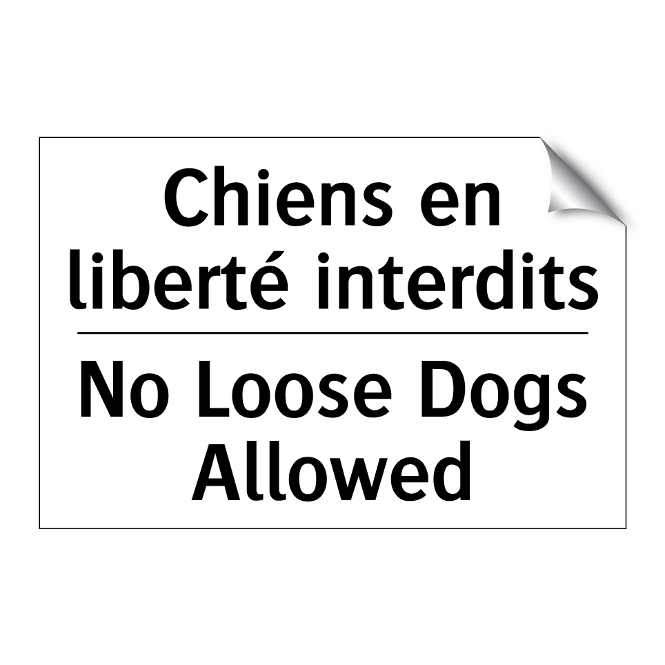 Panneau d'interdiction bilingue avec texte en français : "Chiens en liberté interdits", et en anglais : "No Loose Dogs Allowed"