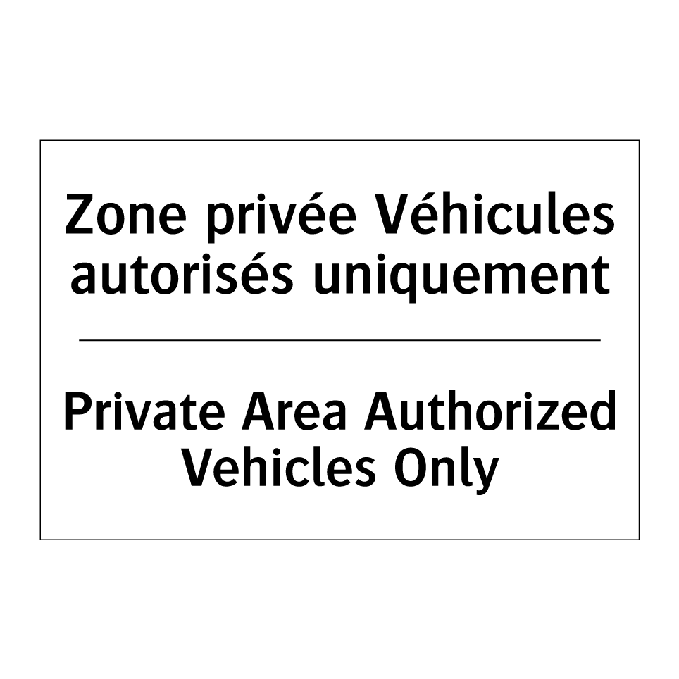Panneau d'interdiction bilingue avec texte en français : "Zone privée Véhicules autorisés uniquement", et en anglais : "Private Area Authorized Vehicles Only"
