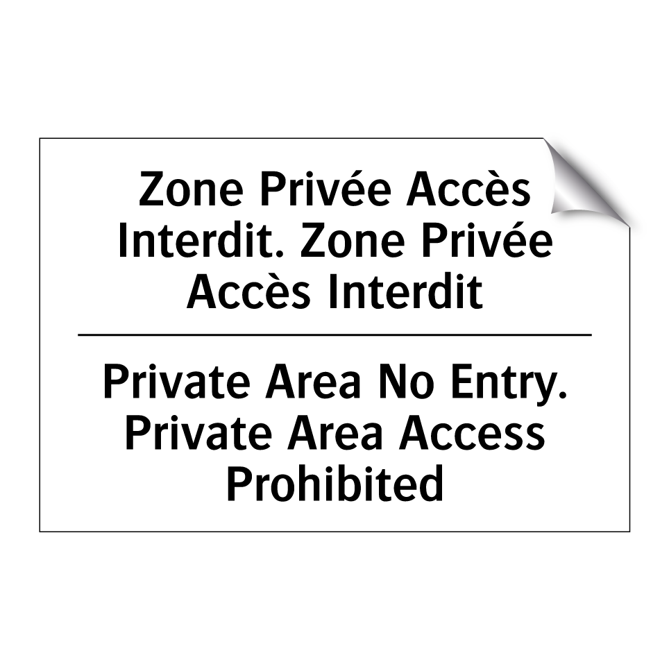 Panneau d'interdiction bilingue avec texte en français : "Zone Privée Accès Interdit. Zone Privée Accès Interdit", et en anglais : "Private Area No Entry. Private Area Access Prohibited"