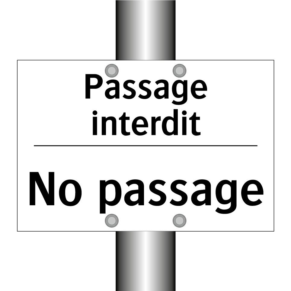 Panneau d'interdiction bilingue avec texte en français : "Passage interdit", et en anglais : "No passage"