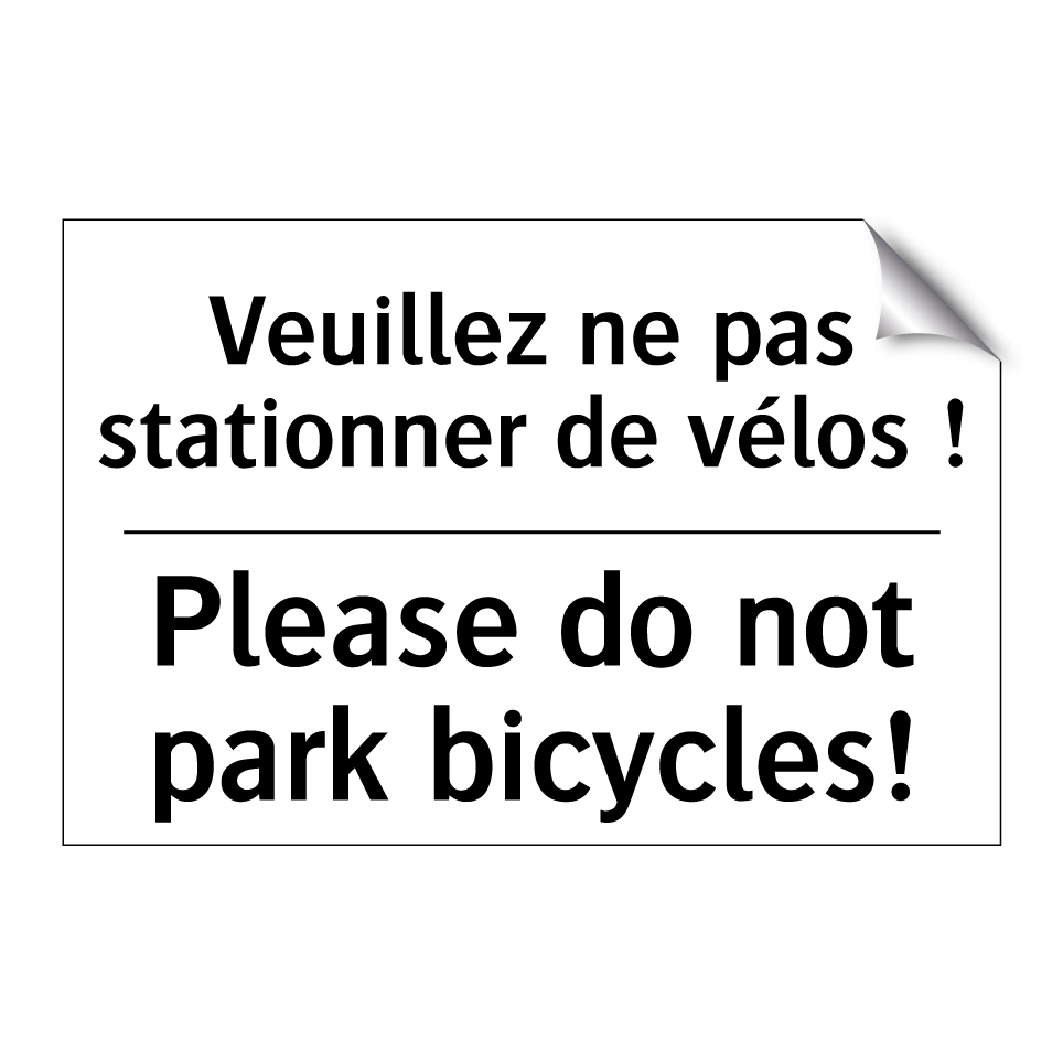 Panneau d'interdiction bilingue avec texte en français : "Veuillez ne pas stationner de vélos !", et en anglais : "Please do not park bicycles!"