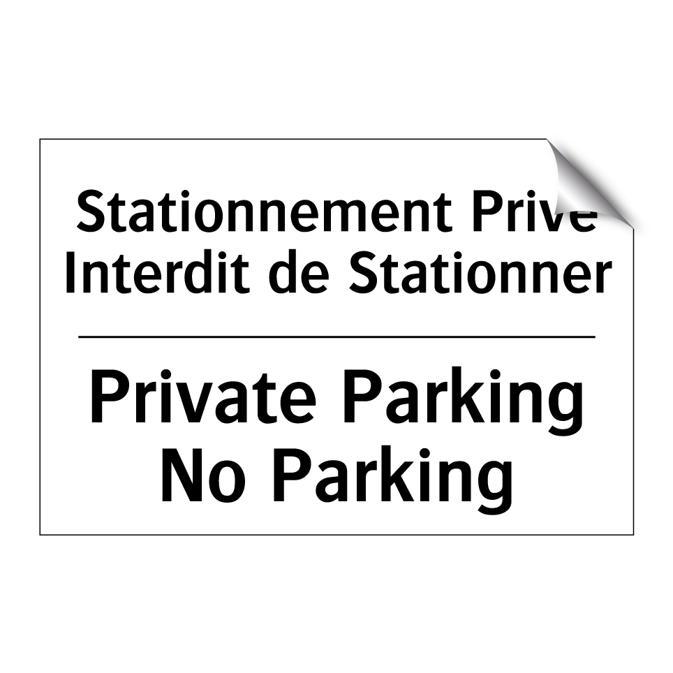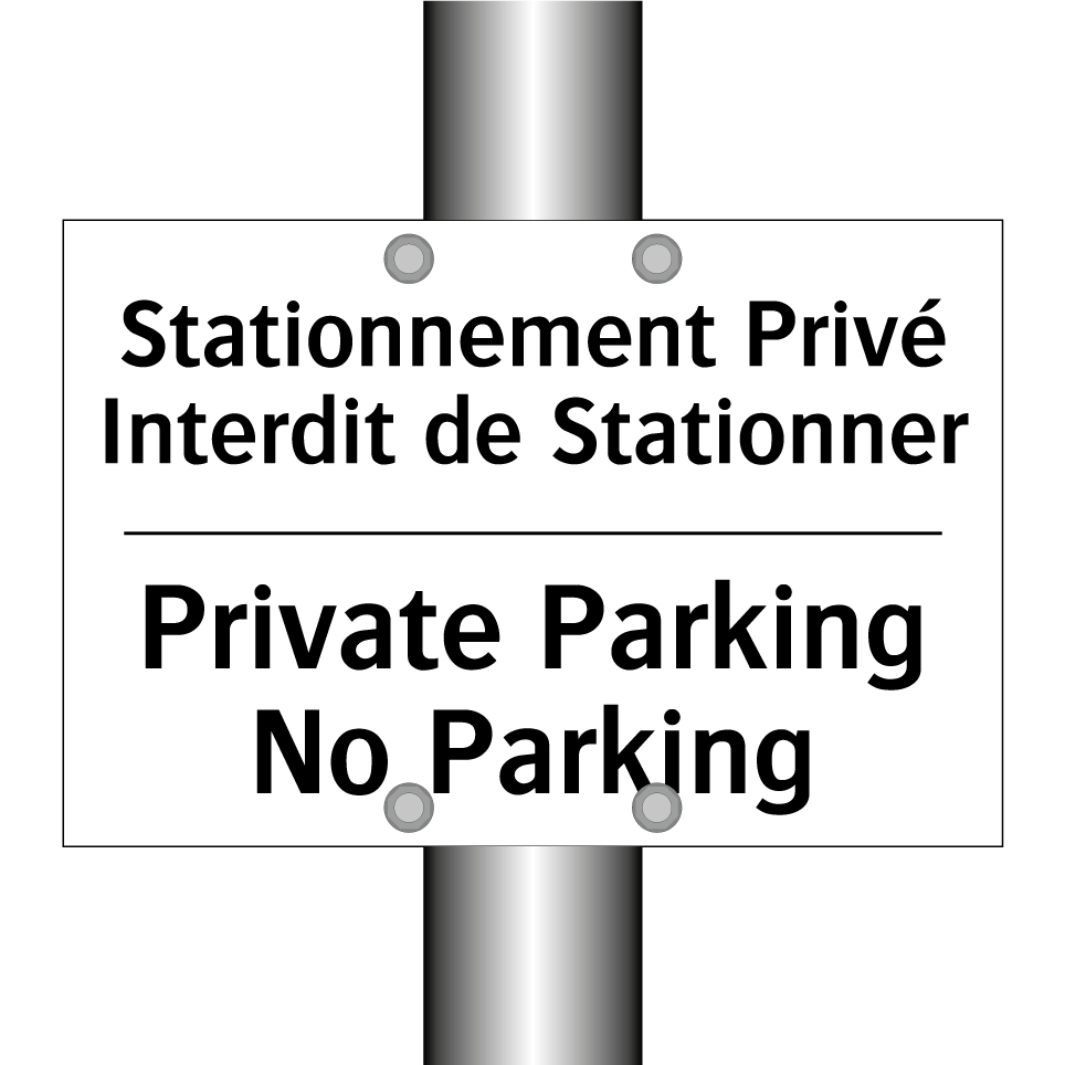 Panneau d'interdiction bilingue avec texte en français : "Stationnement Privé Interdit de Stationner", et en anglais : "Private Parking No Parking"