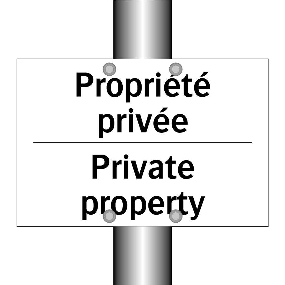 Panneau d'interdiction bilingue avec texte en français : "Propriété privée", et en anglais : "Private property"