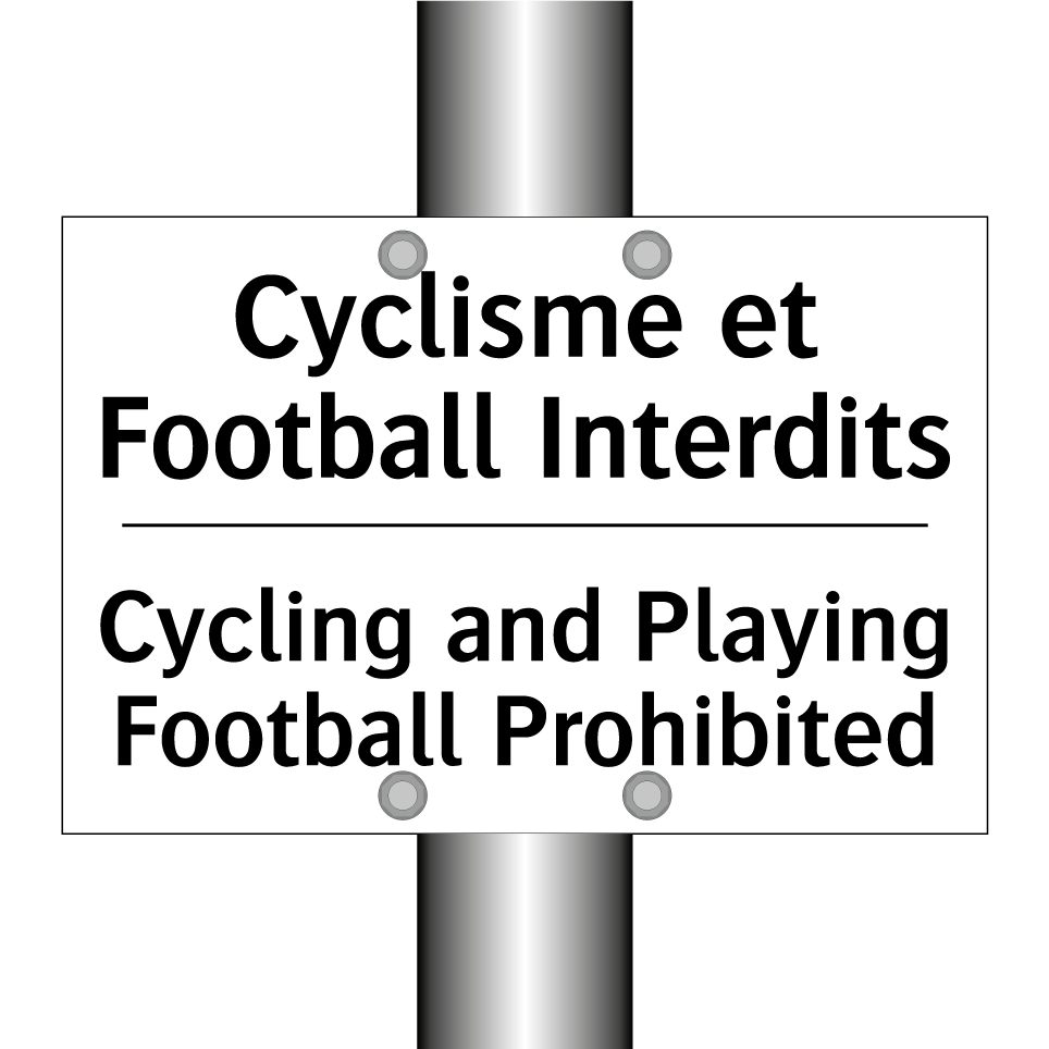 Panneau d'interdiction bilingue avec texte en français : "Cyclisme et Football Interdits", et en anglais : "Cycling and Playing Football Prohibited"