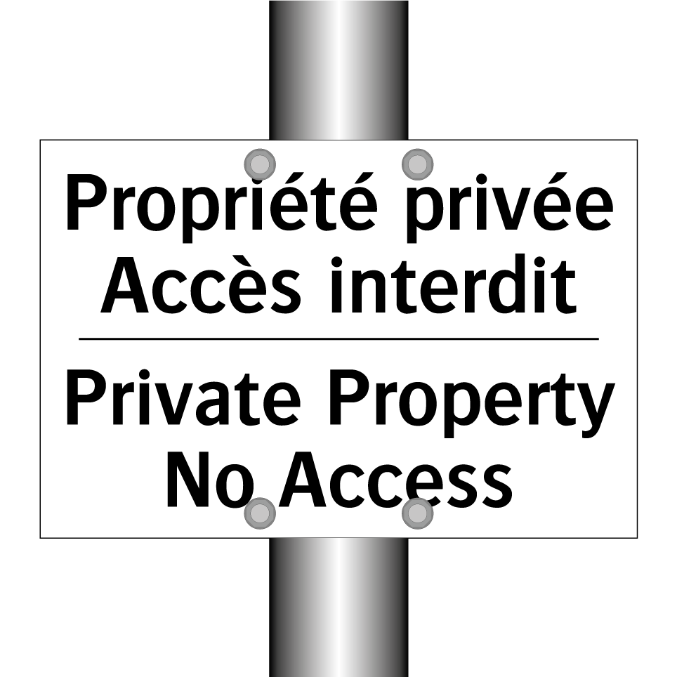Panneau d'interdiction bilingue avec texte en français : "Propriété privée Accès interdit", et en anglais : "Private Property No Access"