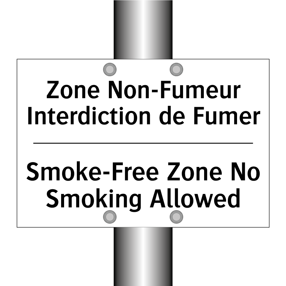 Panneau d'interdiction bilingue avec texte en français : "Zone Non-Fumeur Interdiction de Fumer", et en anglais : "Smoke-Free Zone No Smoking Allowed"