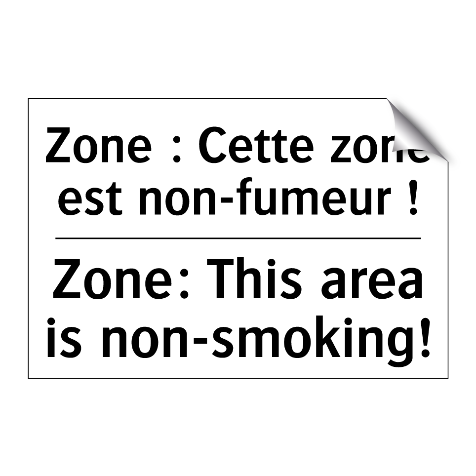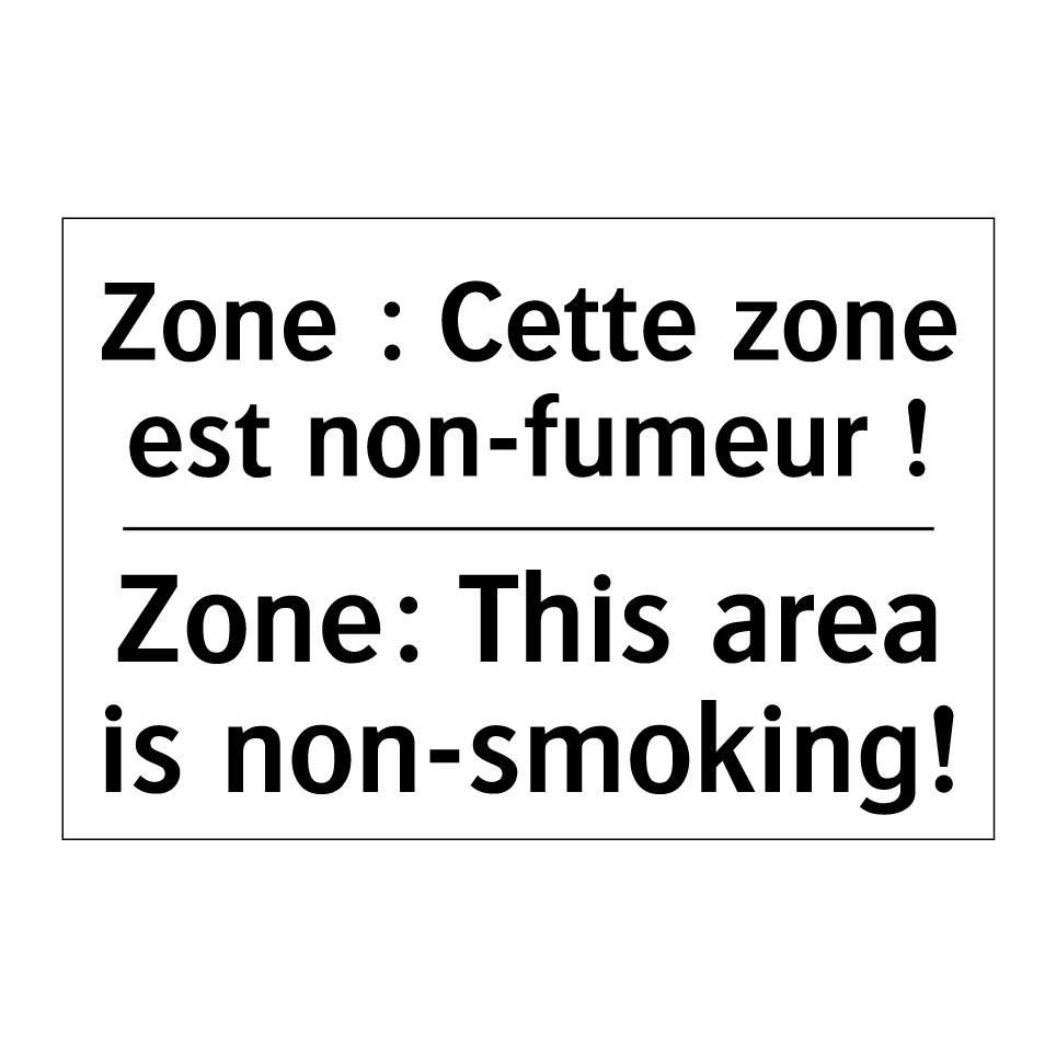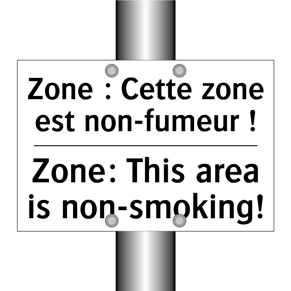 Panneau d'interdiction bilingue avec texte en français : "Zone : Cette zone est non-fumeur !", et en anglais : "Zone: This area is non-smoking!"