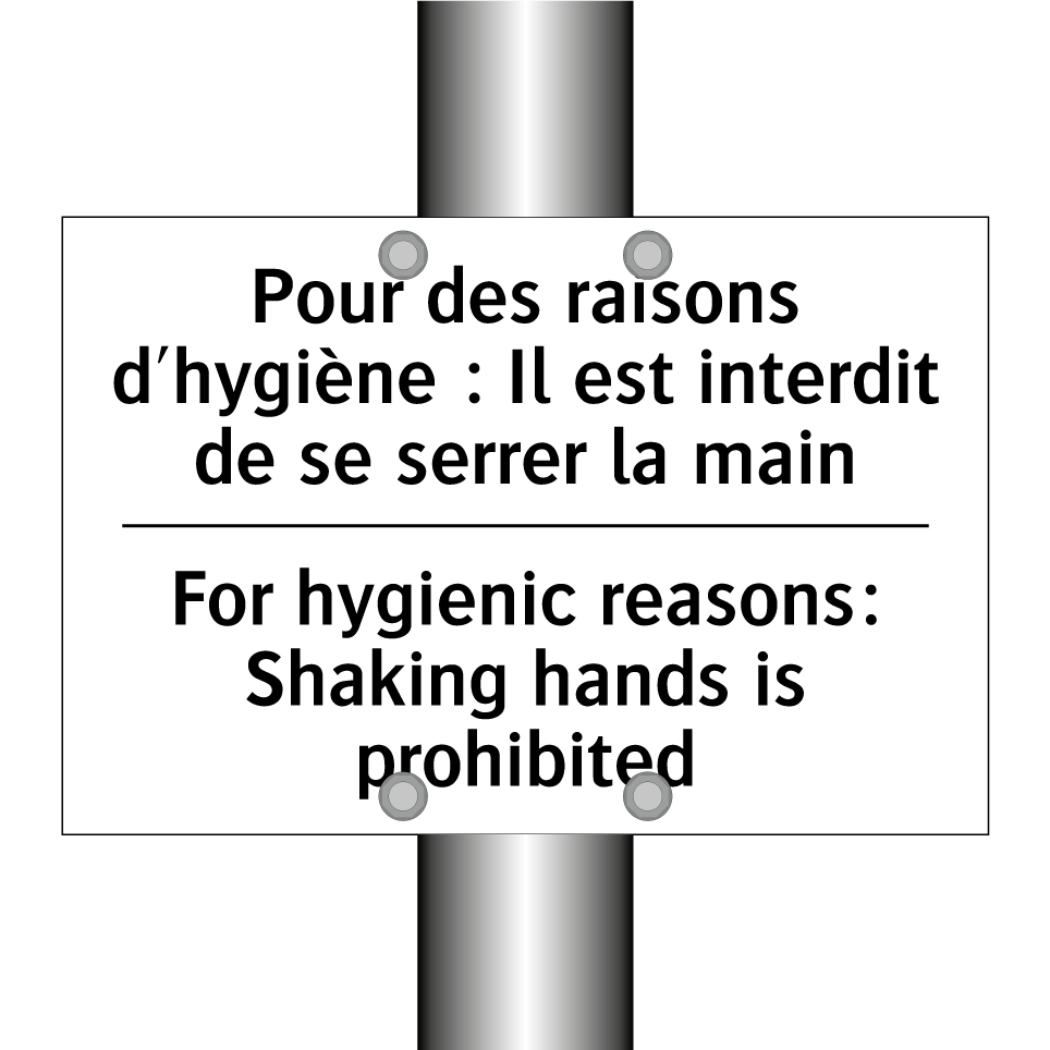 Panneau d'interdiction bilingue avec texte en français : "Pour des raisons d'hygiène : Il est interdit de se serrer la main", et en anglais : "For hygienic reasons: Shaking hands is prohibited"
