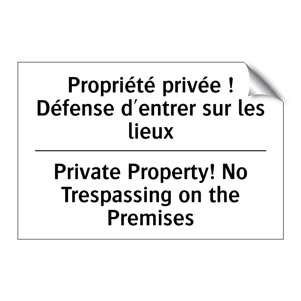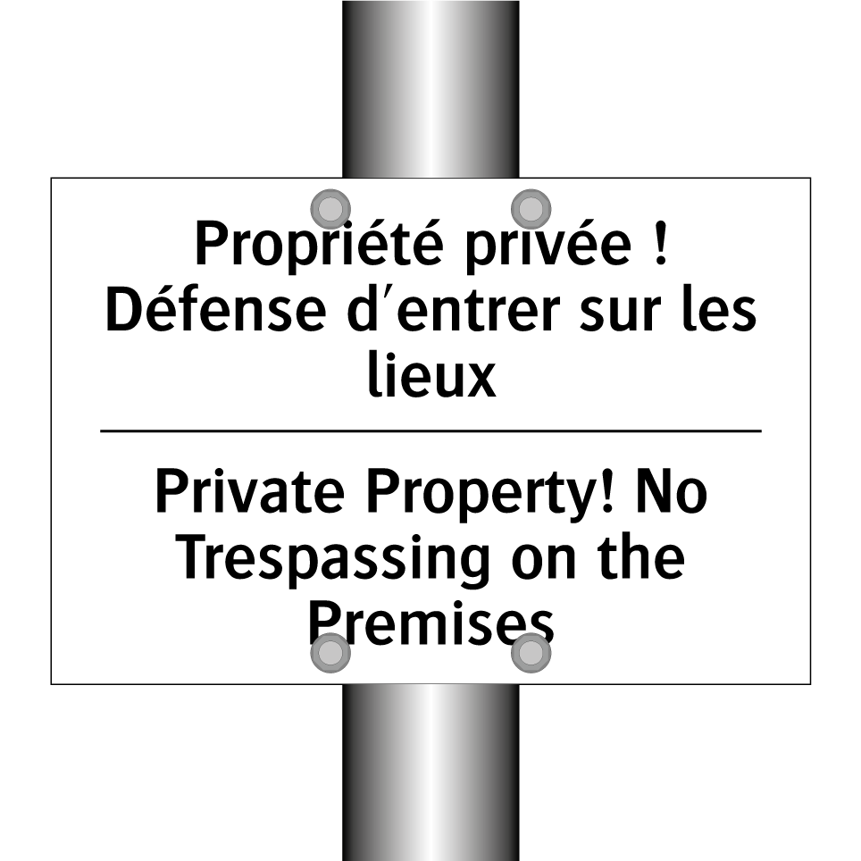 Panneau d'interdiction bilingue avec texte en français : "Propriété privée ! Défense d'entrer sur les lieux", et en anglais : "Private Property! No Trespassing on the Premises"