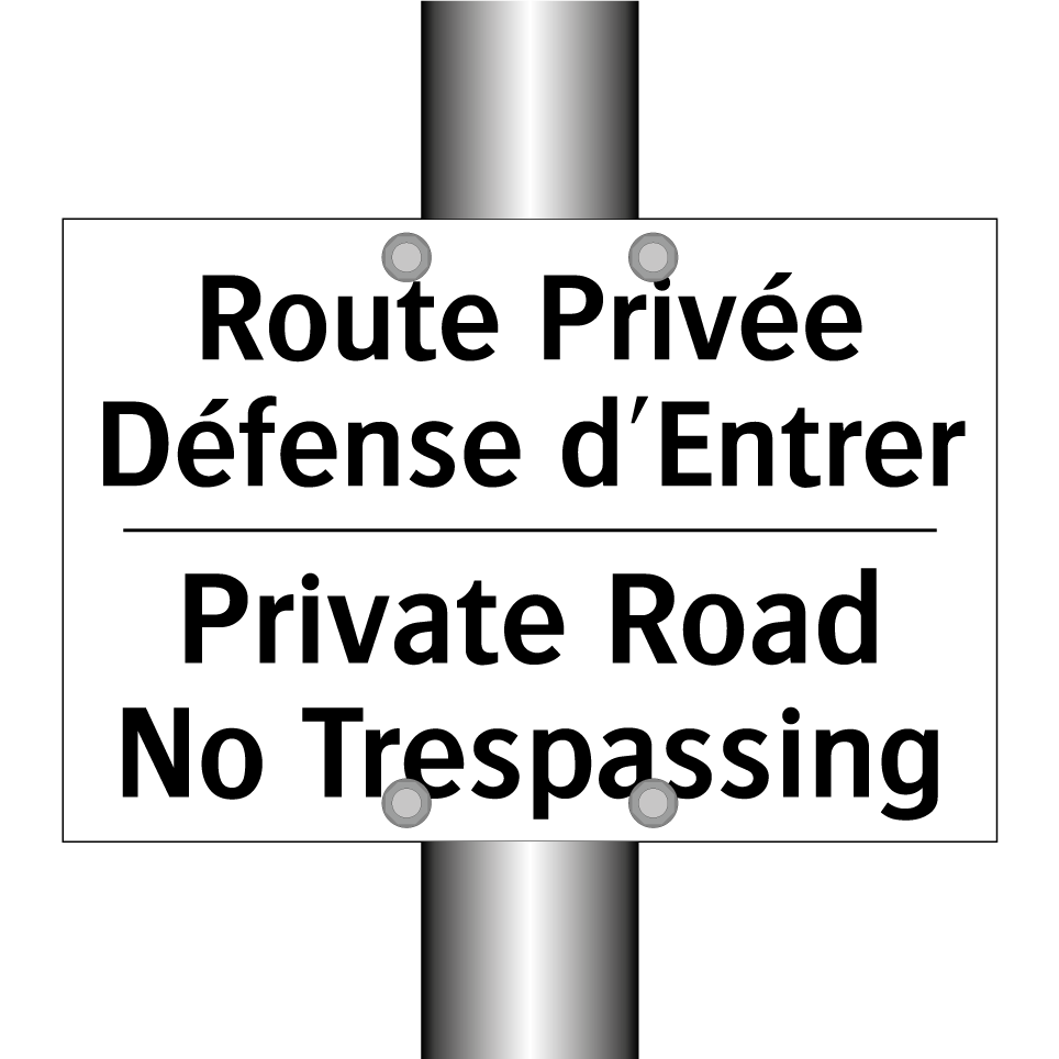 Panneau d'interdiction bilingue avec texte en français : "Route Privée Défense d'Entrer", et en anglais : "Private Road No Trespassing"