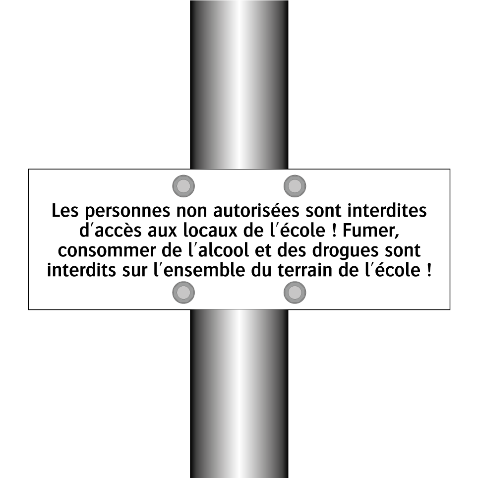Panneau d'interdiction avec le texte : "Les personnes non autorisées sont interdites d'accès aux locaux de l'école ! Fumer, consommer de l'alcool et des drogues sont interdits sur l'ensemble du terrain de l'école !"