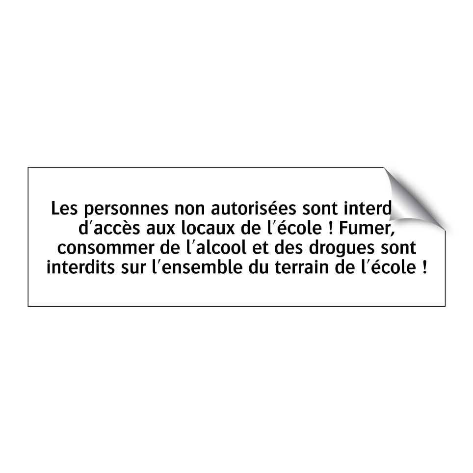 Sur les pages de catégorie ci-dessous, vous trouverez plus de produits similaires à Les personnes non autorisées sont interdites d'accès aux locaux de l'école ! Fumer, consommer de l'alcool et des drogues sont interdits sur l'ensemble du terrain de l'école !. Cliquez ci-dessous pour découvrir plus de produits.