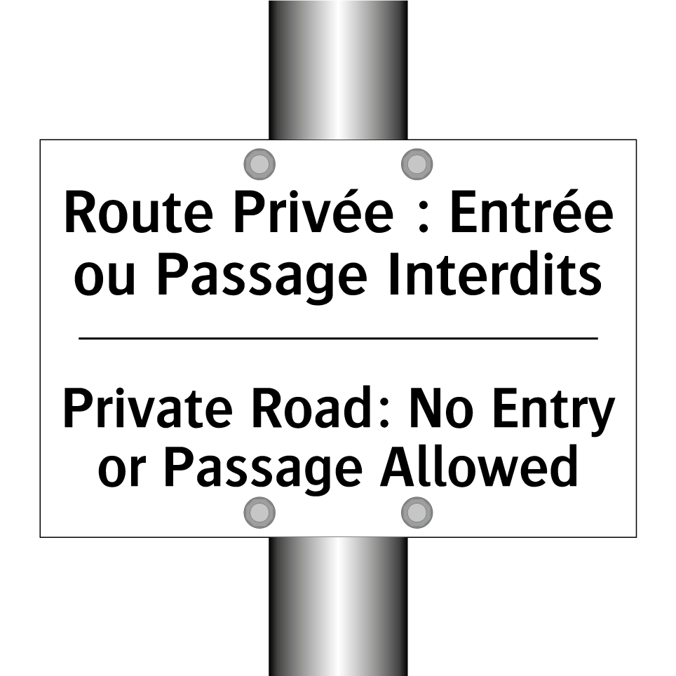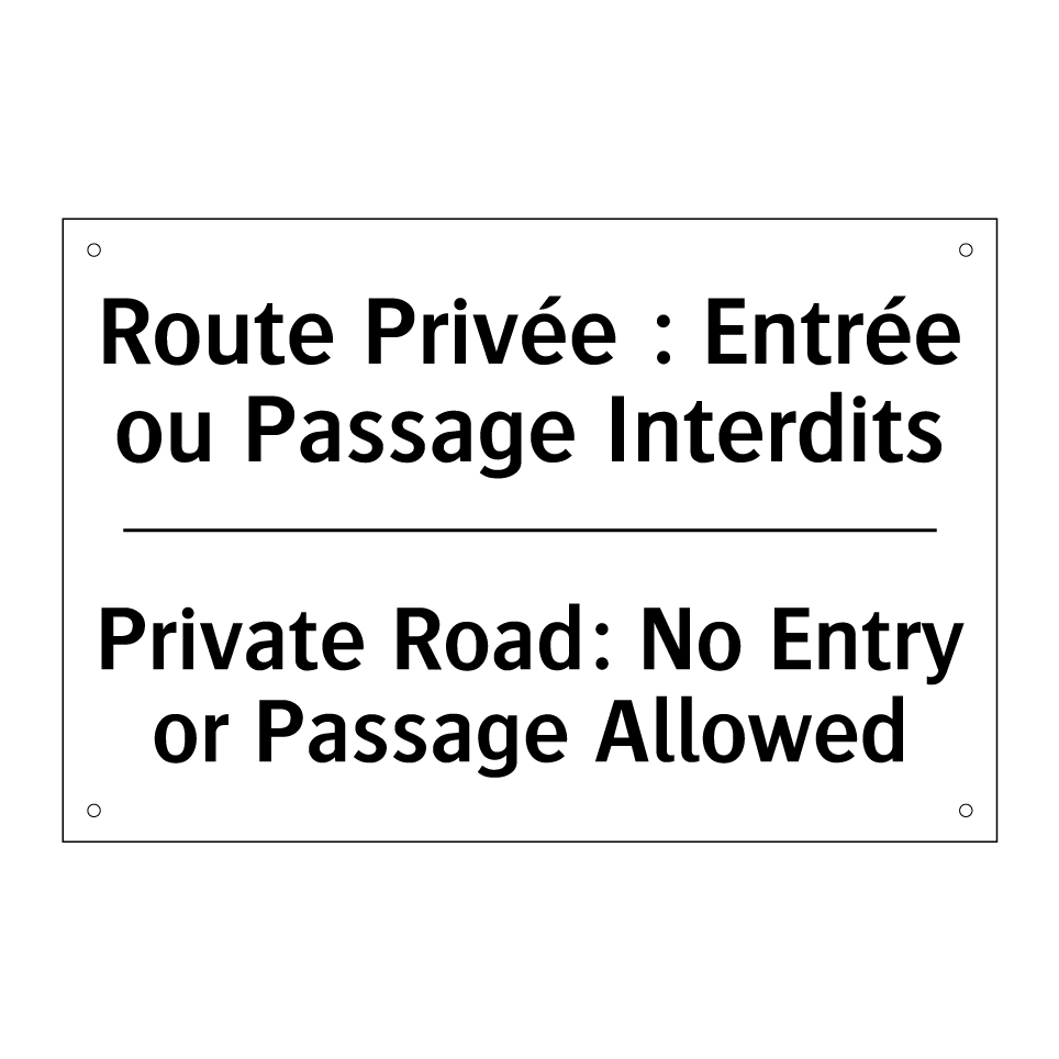 Panneau d'interdiction bilingue avec texte en français : "Route Privée : Entrée ou Passage Interdits", et en anglais : "Private Road: No Entry or Passage Allowed"