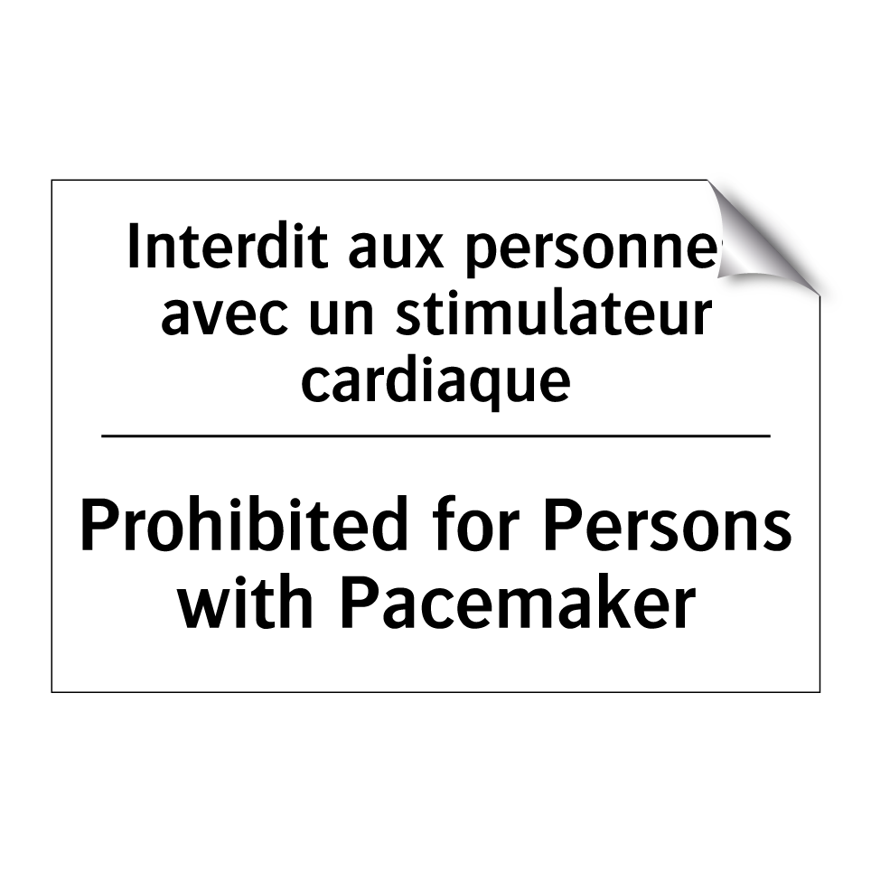Panneau d'interdiction bilingue avec texte en français : "Interdit aux personnes avec un stimulateur cardiaque", et en anglais : "Prohibited for Persons with Pacemaker"