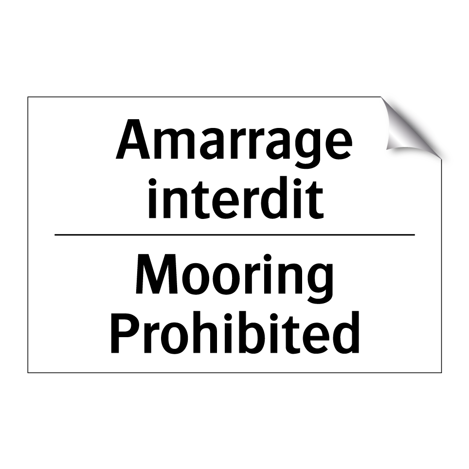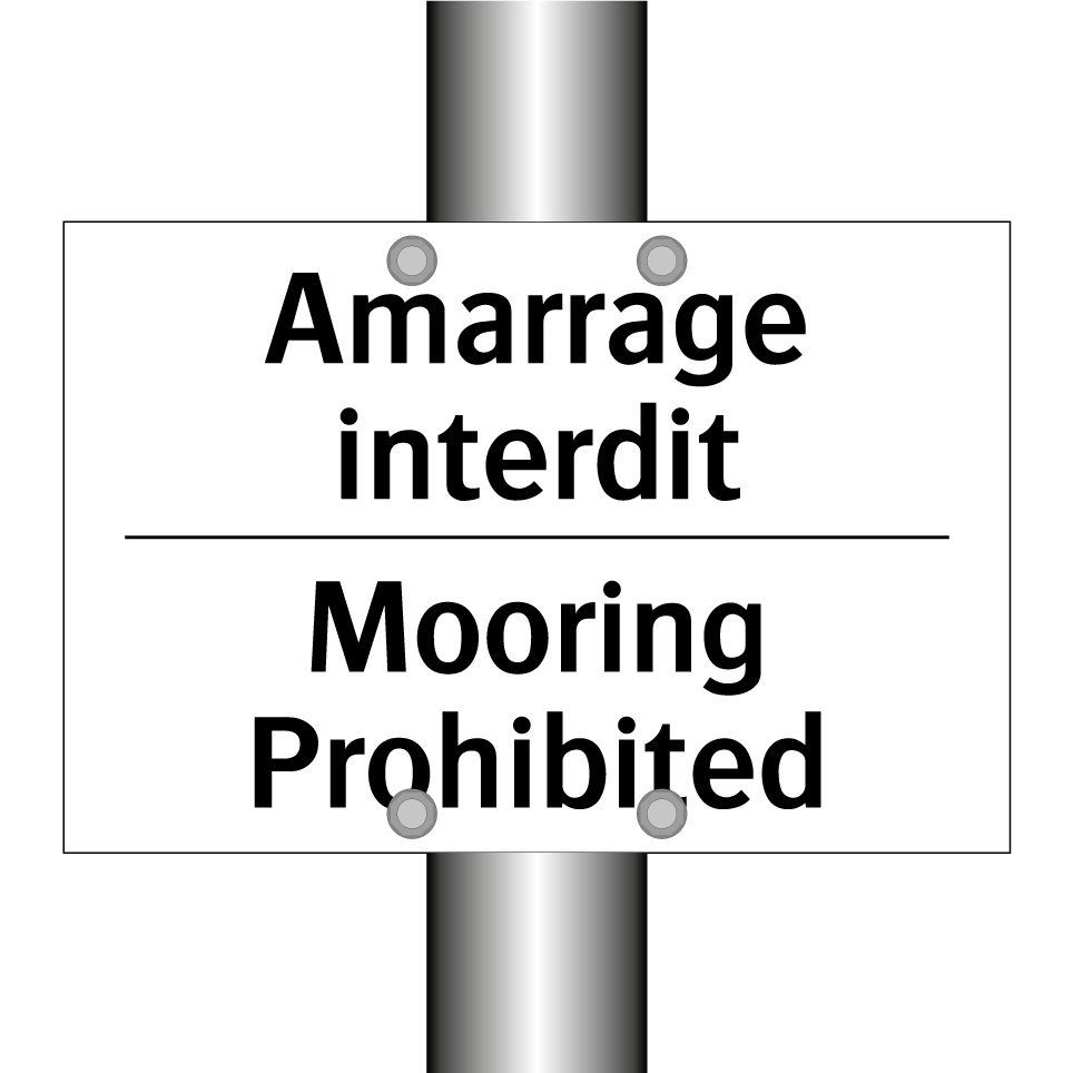 Panneau d'interdiction bilingue avec texte en français : "Amarrage interdit", et en anglais : "Mooring Prohibited"