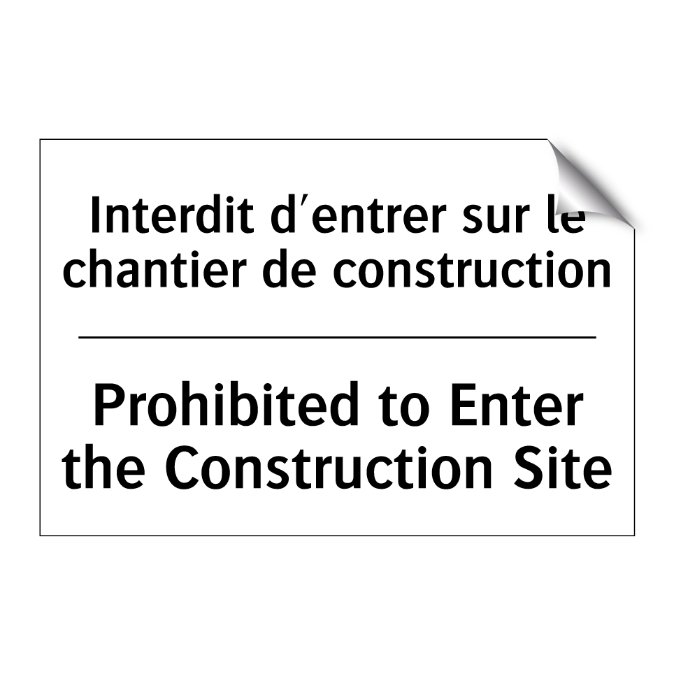 Panneau d'interdiction bilingue avec texte en français : "Interdit d'entrer sur le chantier de construction", et en anglais : "Prohibited to Enter the Construction Site"