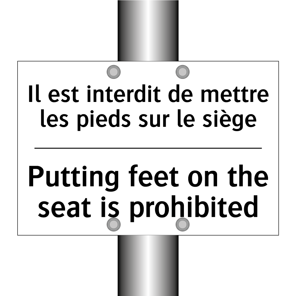 Panneau d'interdiction bilingue avec texte en français : "Il est interdit de mettre les pieds sur le siège", et en anglais : "Putting feet on the seat is prohibited"