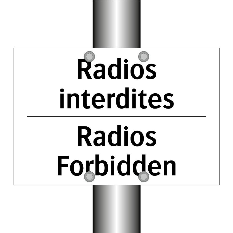 Panneau d'interdiction bilingue avec texte en français : "Radios interdites", et en anglais : "Radios Forbidden"