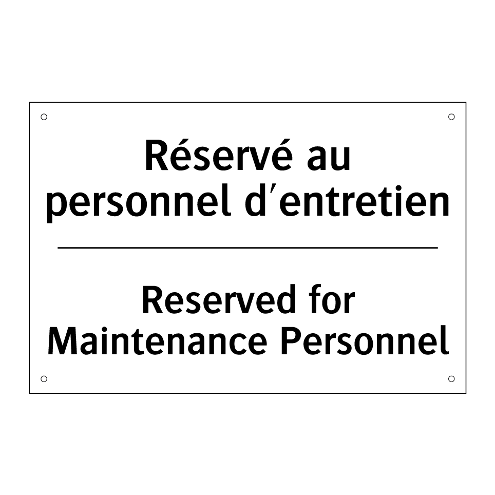 Panneau d'interdiction bilingue avec texte en français : "Réservé au personnel d'entretien", et en anglais : "Reserved for Maintenance Personnel"