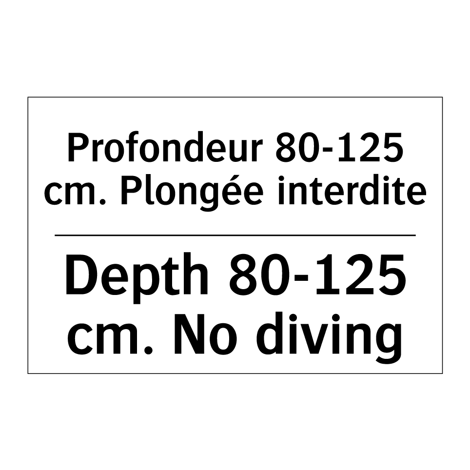 Panneau d'interdiction bilingue avec texte en français : "Profondeur 80-125 cm. Plongée interdite", et en anglais : "Depth 80-125 cm. No diving"