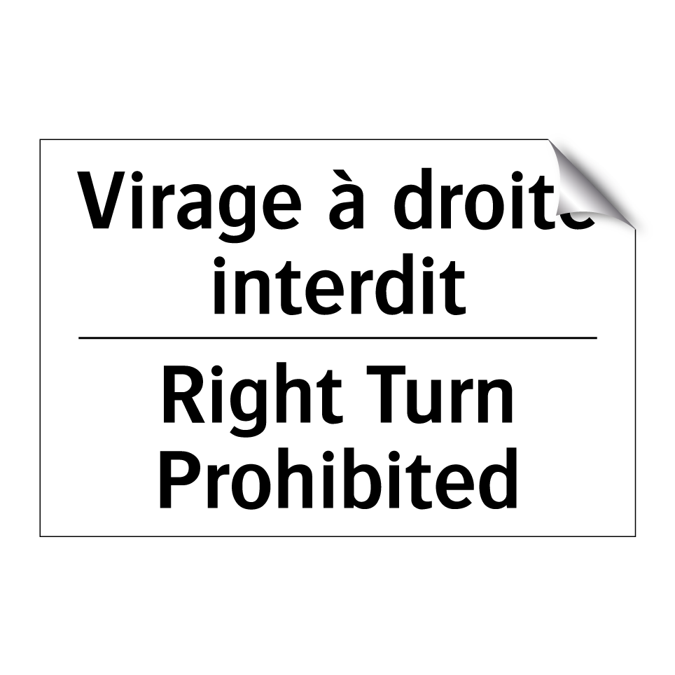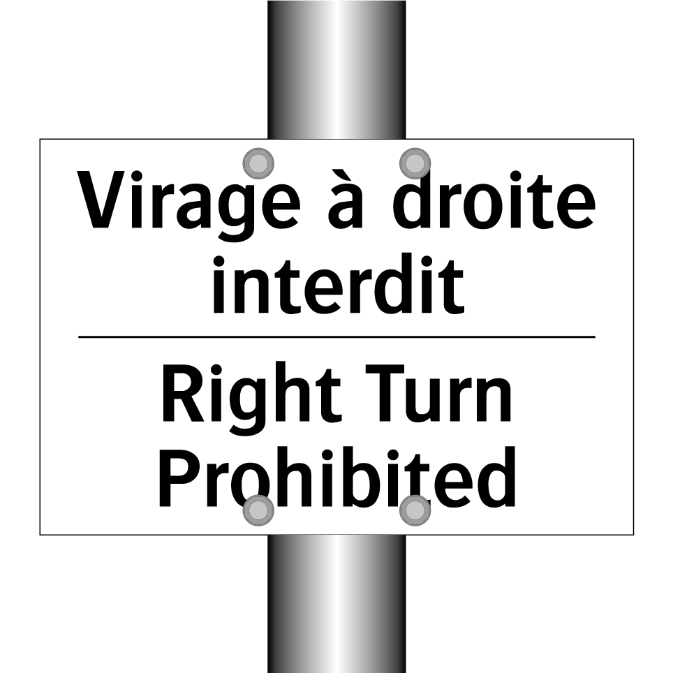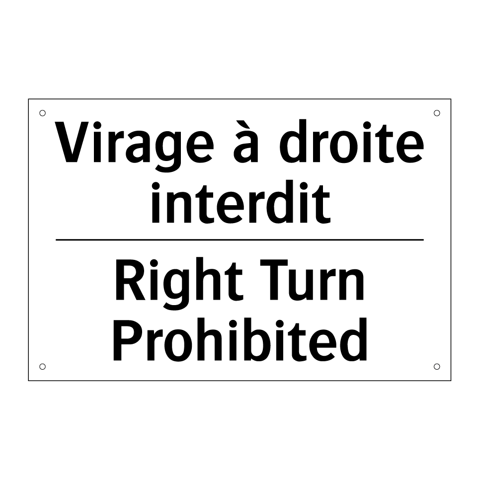 Panneau d'interdiction bilingue avec texte en français : "Virage à droite interdit", et en anglais : "Right Turn Prohibited"