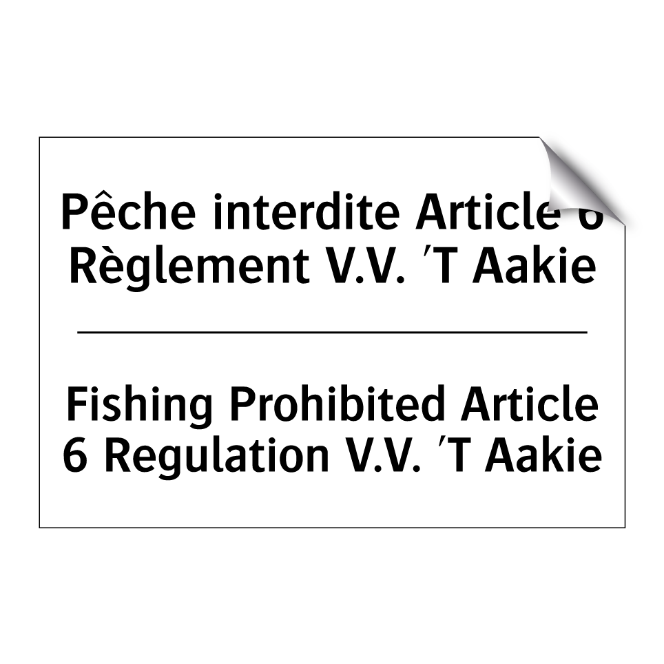 Panneau d'interdiction bilingue avec texte en français : "Pêche interdite Article 6 Règlement V.V. 'T Aakie", et en anglais : "Fishing Prohibited Article 6 Regulation V.V. 'T Aakie"