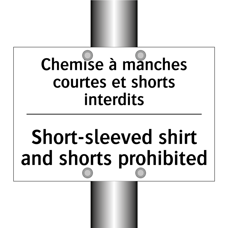 Panneau d'interdiction bilingue avec texte en français : "Chemise à manches courtes et shorts interdits", et en anglais : "Short-sleeved shirt and shorts prohibited"