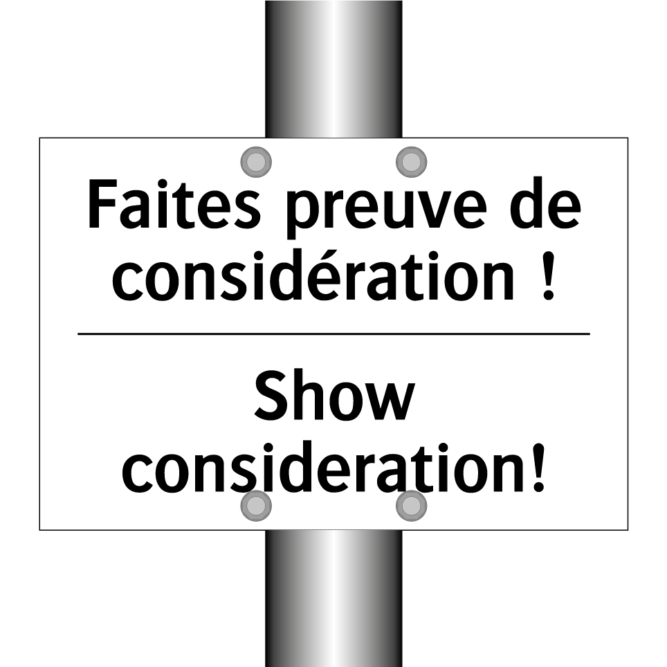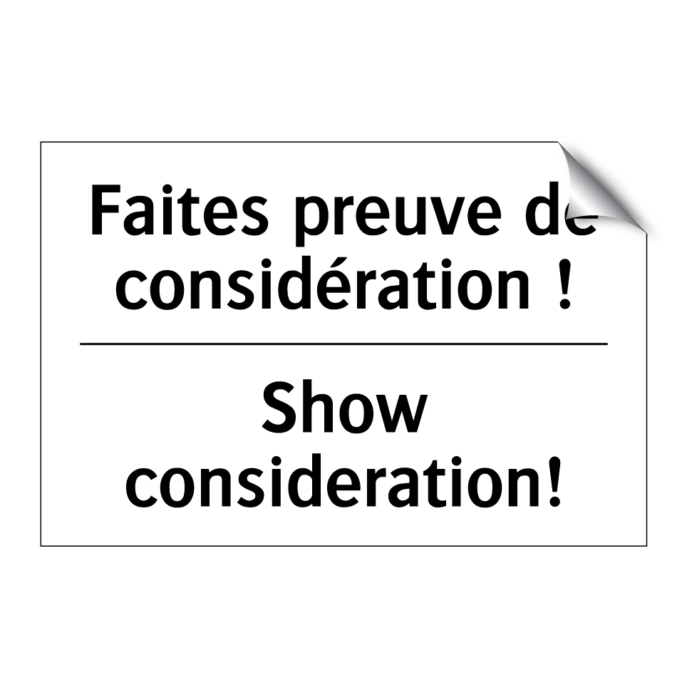 Panneau d'interdiction bilingue avec texte en français : "Faites preuve de considération !", et en anglais : "Show consideration!"