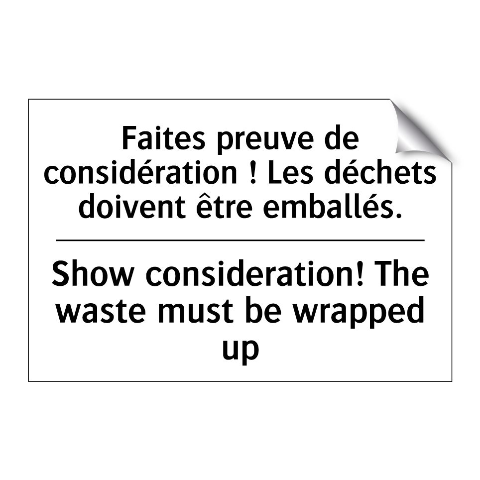 Panneau d'interdiction bilingue avec texte en français : "Faites preuve de considération ! Les déchets doivent être emballés.", et en anglais : "Show consideration! The waste must be wrapped up"
