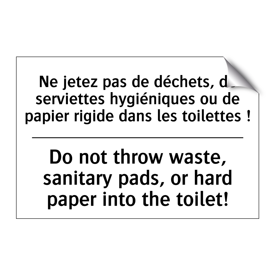 Panneau d'interdiction bilingue avec texte en français : "Ne jetez pas de déchets, de serviettes hygiéniques ou de papier rigide dans les toilettes !", et en anglais : "Do not throw waste, sanitary pads, or hard paper into the toilet!"
