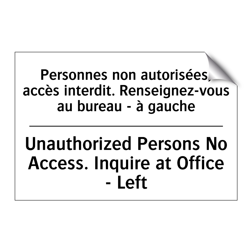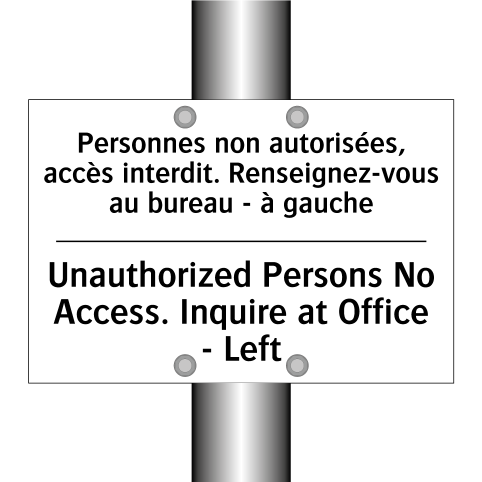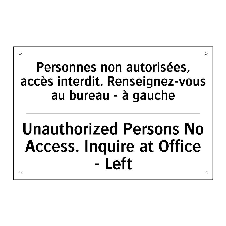 Panneau d'interdiction bilingue avec texte en français : "Personnes non autorisées, accès interdit. Renseignez-vous au bureau - à gauche", et en anglais : "Unauthorized Persons No Access. Inquire at Office - Left"