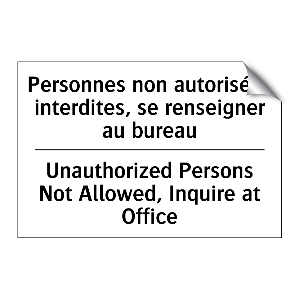 Panneau d'interdiction bilingue avec texte en français : "Personnes non autorisées interdites, se renseigner au bureau", et en anglais : "Unauthorized Persons Not Allowed, Inquire at Office"