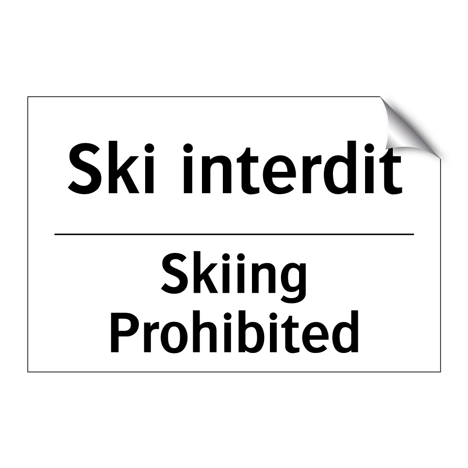 Panneau d'interdiction bilingue avec texte en français : "Ski interdit", et en anglais : "Skiing Prohibited"