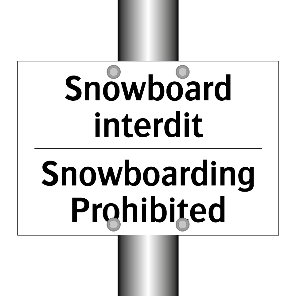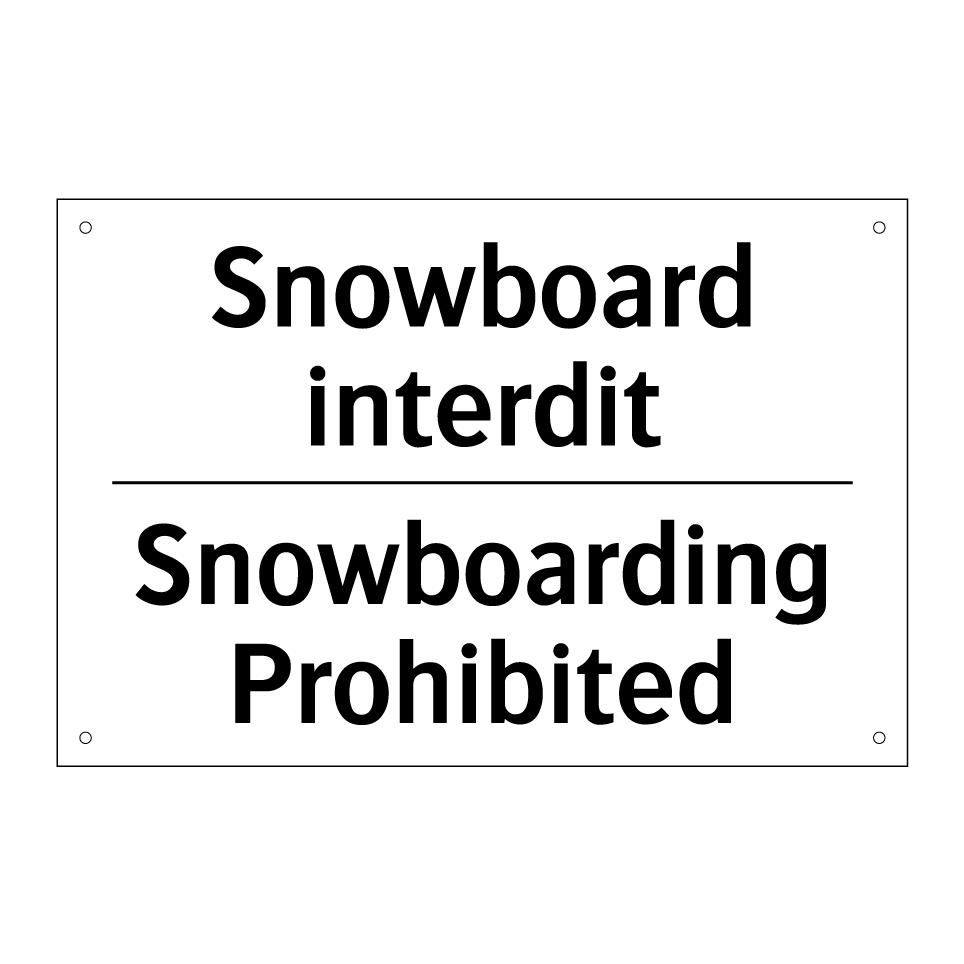 Panneau d'interdiction bilingue avec texte en français : "Snowboard interdit", et en anglais : "Snowboarding Prohibited"