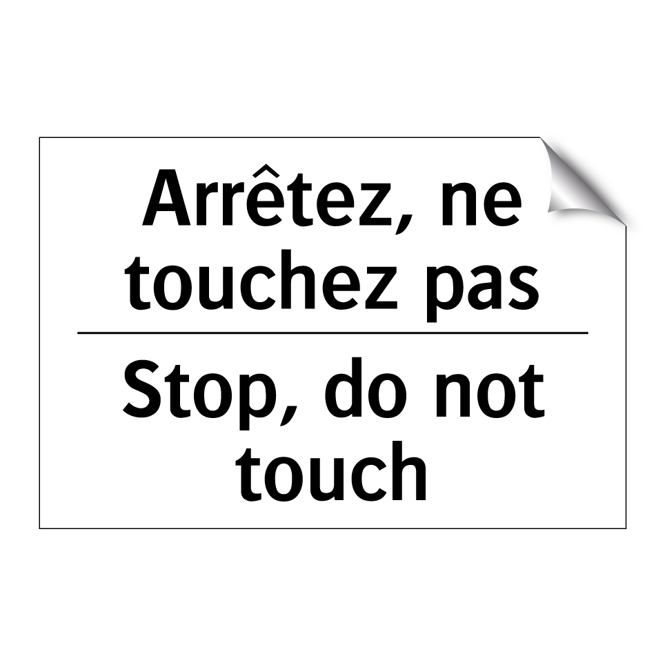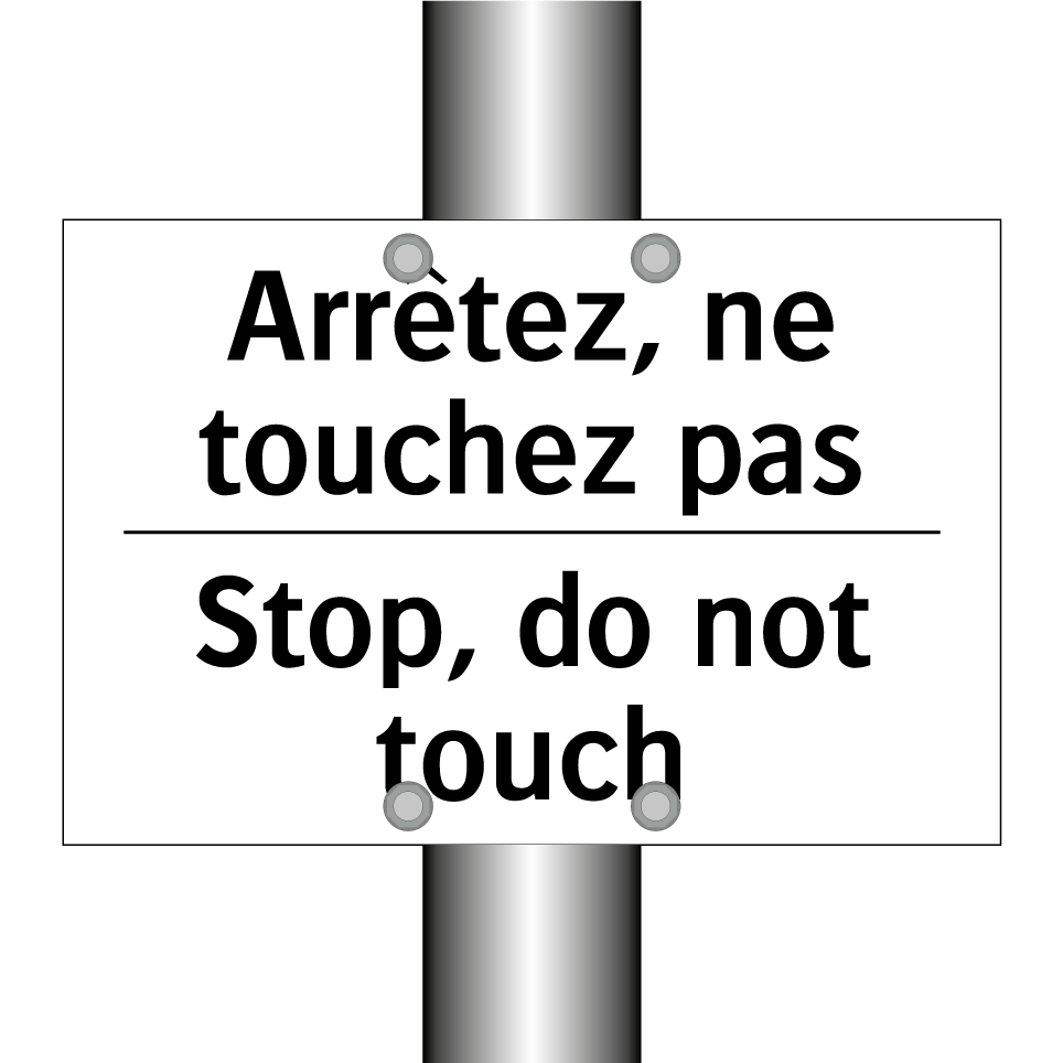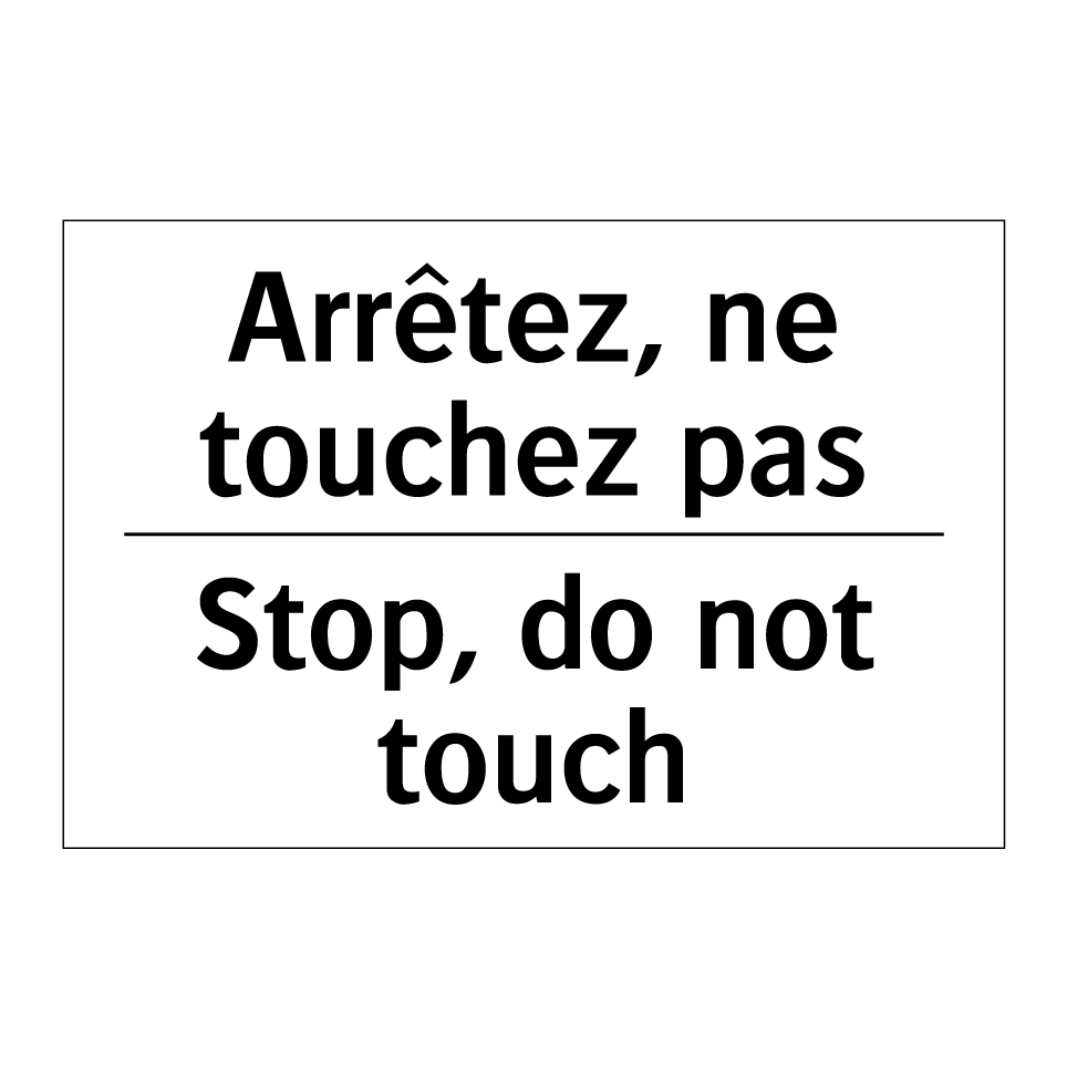 Panneau d'interdiction bilingue avec texte en français : "Arrêtez, ne touchez pas", et en anglais : "Stop, do not touch"