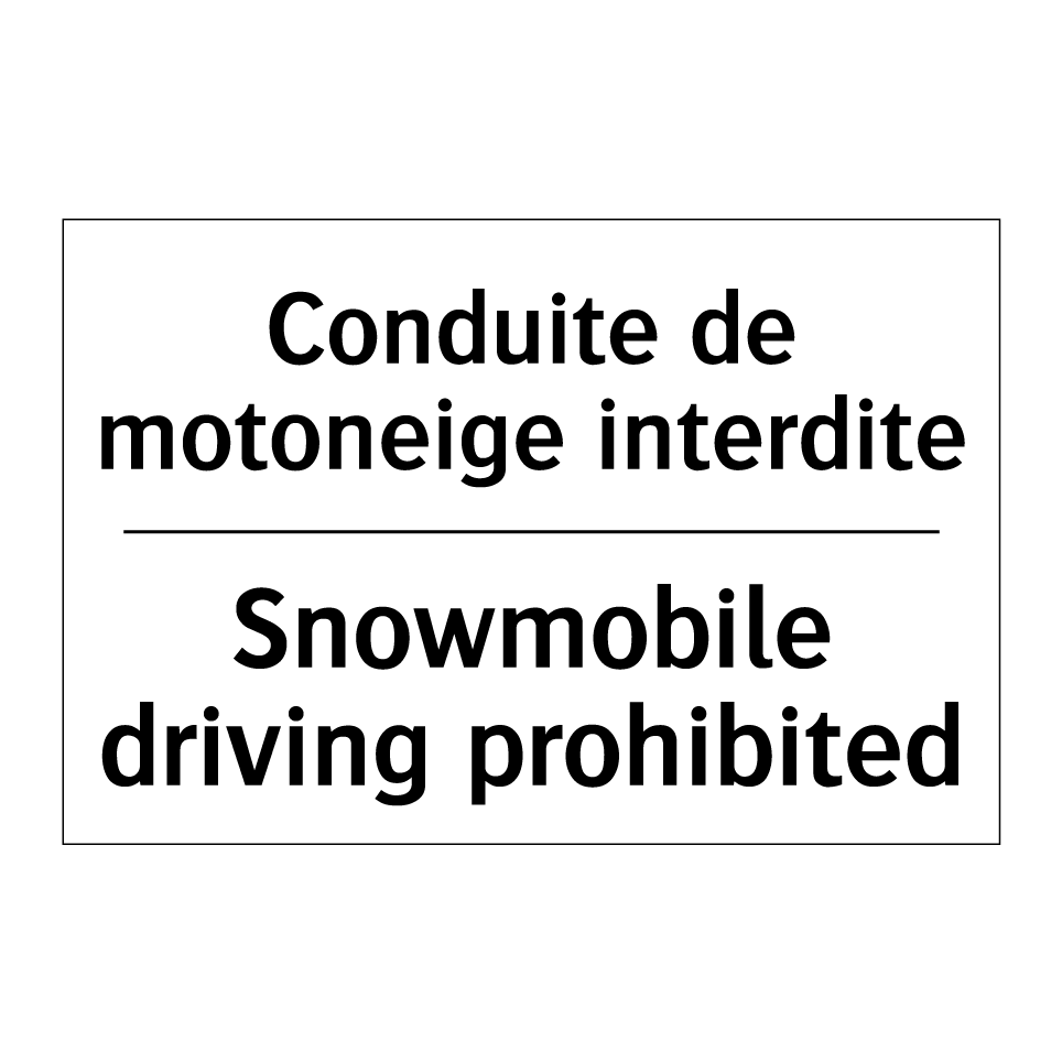 Panneau d'interdiction bilingue avec texte en français : "Conduite de motoneige interdite", et en anglais : "Snowmobile driving prohibited"