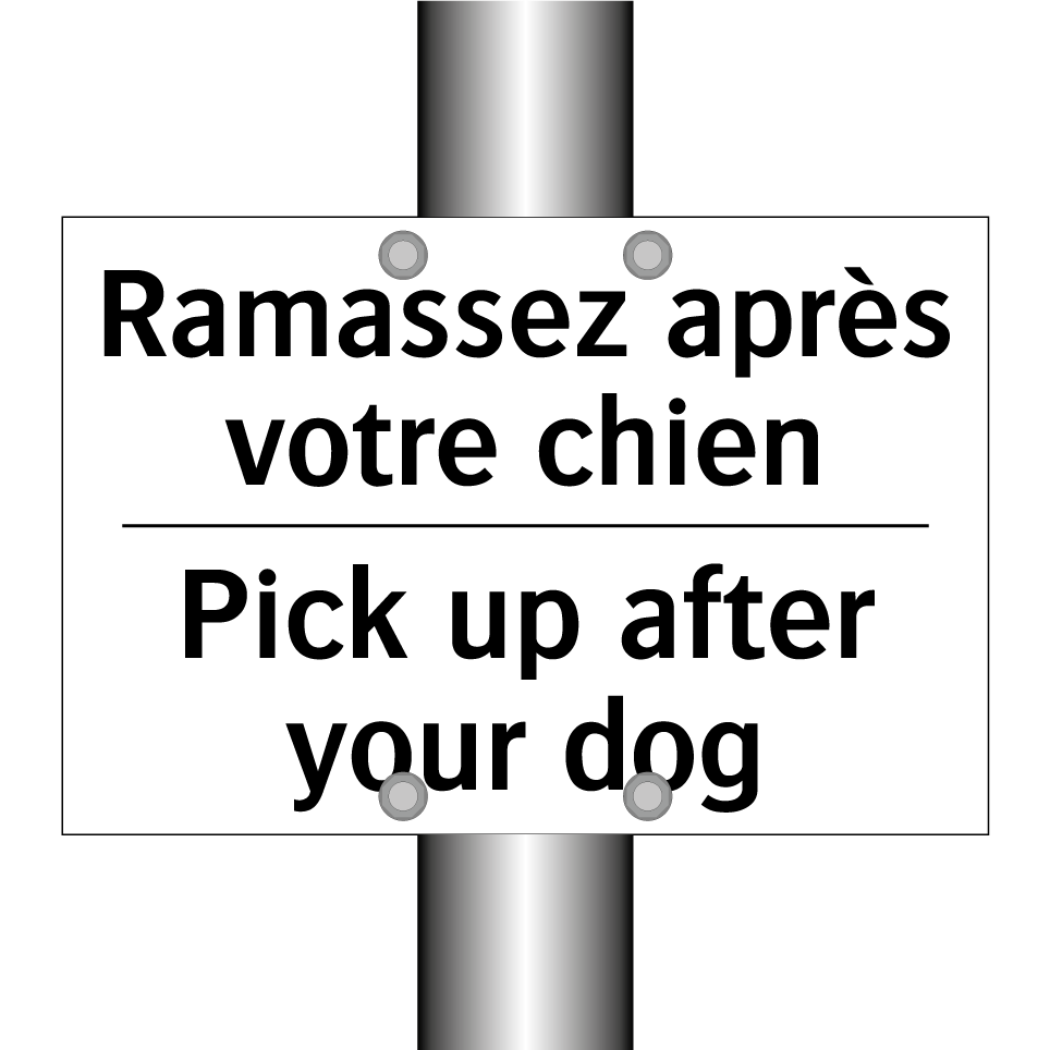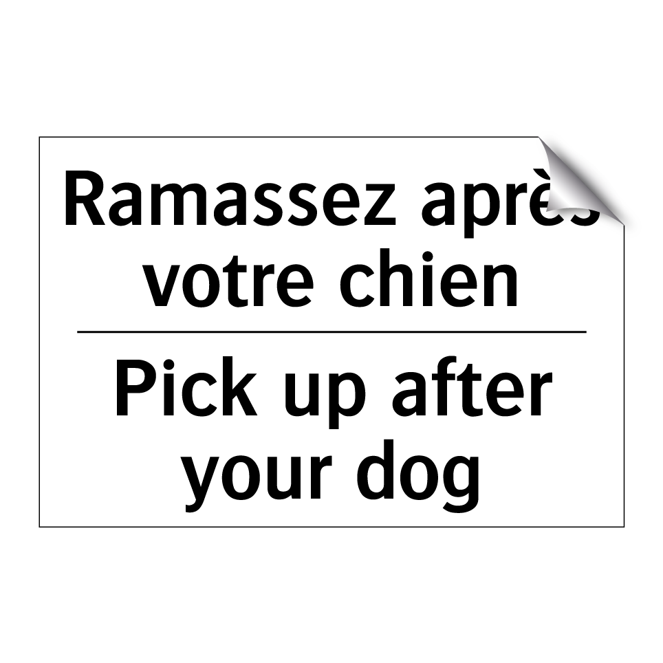 Panneau d'interdiction bilingue avec texte en français : "Ramassez après votre chien", et en anglais : "Pick up after your dog"