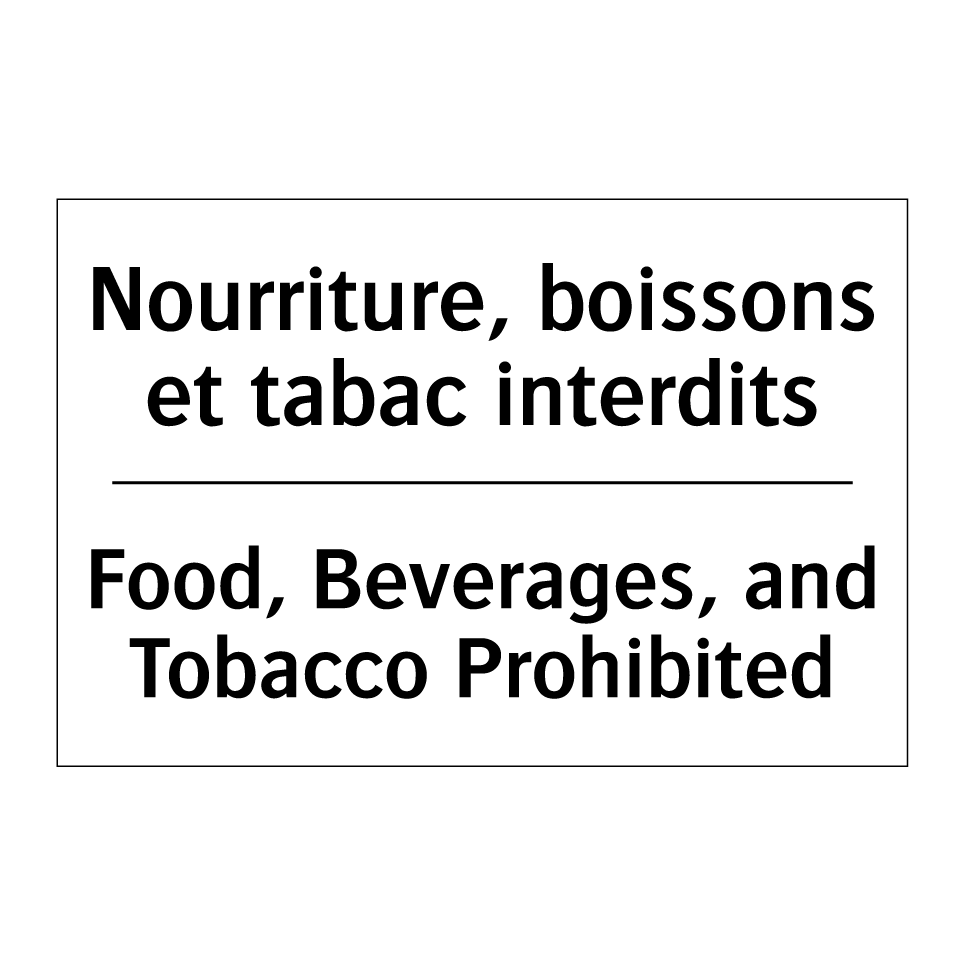 Panneau d'interdiction bilingue avec texte en français : "Nourriture, boissons et tabac interdits", et en anglais : "Food, Beverages, and Tobacco Prohibited"