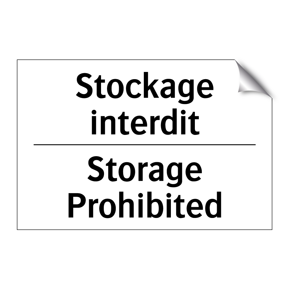 Panneau d'interdiction bilingue avec texte en français : "Stockage interdit", et en anglais : "Storage Prohibited"