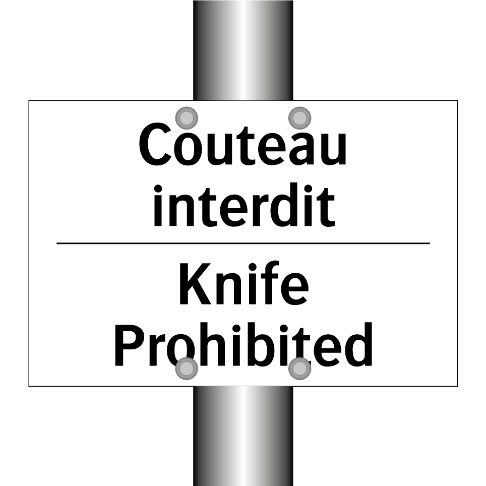 Panneau d'interdiction bilingue avec texte en français : "Couteau interdit", et en anglais : "Knife Prohibited"