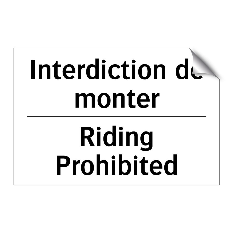 Panneau d'interdiction bilingue avec texte en français : "Interdiction de monter", et en anglais : "Riding Prohibited"