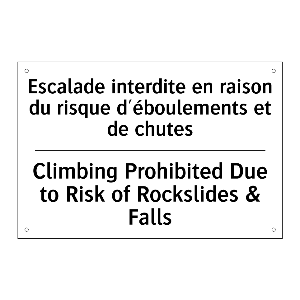 Panneau d'interdiction bilingue avec texte en français : "Escalade interdite en raison du risque d'éboulements et de chutes", et en anglais : "Climbing Prohibited Due to Risk of Rockslides & Falls"